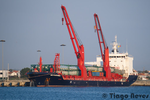 Na imagem vemos as duas gruas NMF vermelhas que juntas são capazes de içar 300T, permitindo a este navio ser "auto-suficiente".